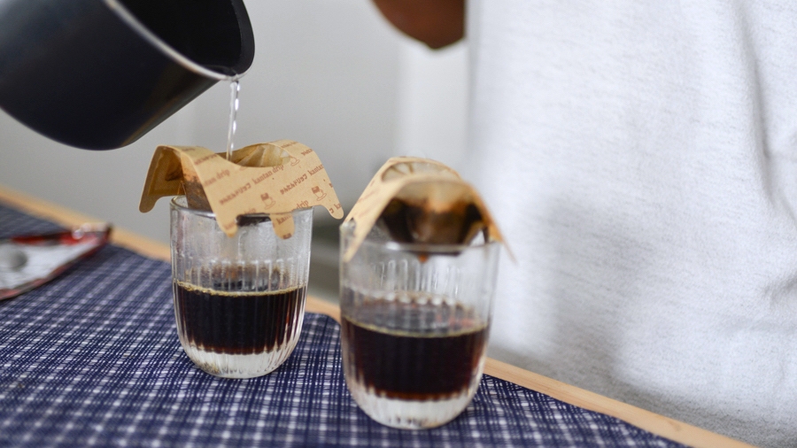 Un café, que je fais à la mode japonaise, avec un filtre directement posé sur la tasse, et un fruit. Là-bas, ils font tous leur café comme ça, même au bureau !