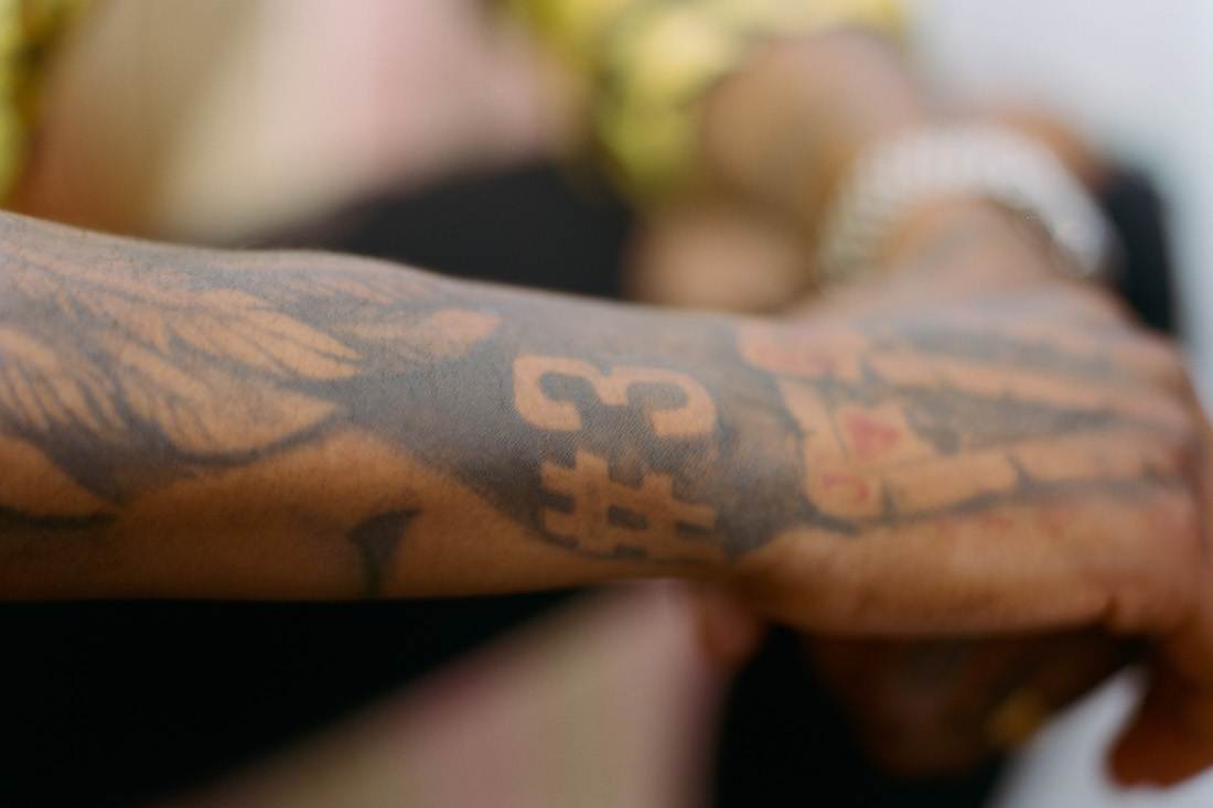 Franchement, je ne pourrais pas les compter. J’ai les deux bras, l’intérieur, les deux mains. J’essaye de ne pas tout faire d’un coup, sinon j’ai plus de place (rires). Mes tatouages, ça représente quelque chose. Ils ont tous une signification pour moi. Je vais pas me faire un ballon de foot parce que je fais du foot, tu vois ?