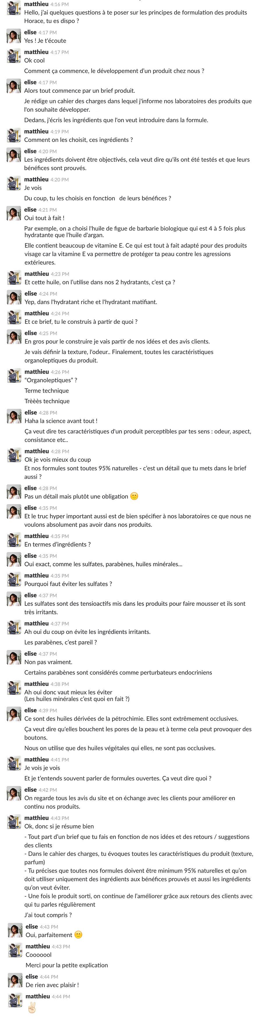 Elise, chef de développement produit, et Matthieu, responsable de l'éditorial, ont discuté sur Slack, notre plateforme de messagerie interne, de nos principes de formulation. Voici une capture d'écran de leur échange. Au menu : comment l'on construit nos formules, ce qu'on met dedans, ce qu'on ne met pas dedans et comment on les améliore en permanence.